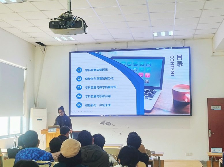 在各类学科竞赛中表现突出,在全国大学生数学建模竞赛中获国家级二等奖1项;在全国大学生统计建模大赛中获国家级三等奖1项;在美国大学生数学建模竞赛中获一等奖2项;在中国大学生计算机设计大赛中获国家级一等奖1项;获省部级奖项若干。宋传静详细解读了学校学科竞赛奖励办法,特别说明了学科竞赛对师生成长的促进作用,鼓励师生积极参与学科竞赛。
